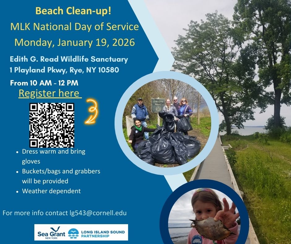 January 19 @ 10:00 am - 12:00 pm MLK National Day of Service Beach Clean-Up Edith G. Read Wildlife Sanctuary 1 Playland Pkwy, Rye, NY Community Events Join NY Sea Grant for a beach clean-up at Edith G. Read Wildlife Sanctuary in Rye, NY. This event is…
